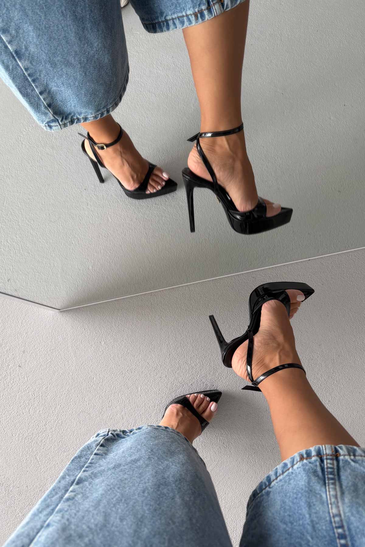 Giulia Bilekten Bantlı İnce Topuk 13 Cm Siyah Rugan Platform