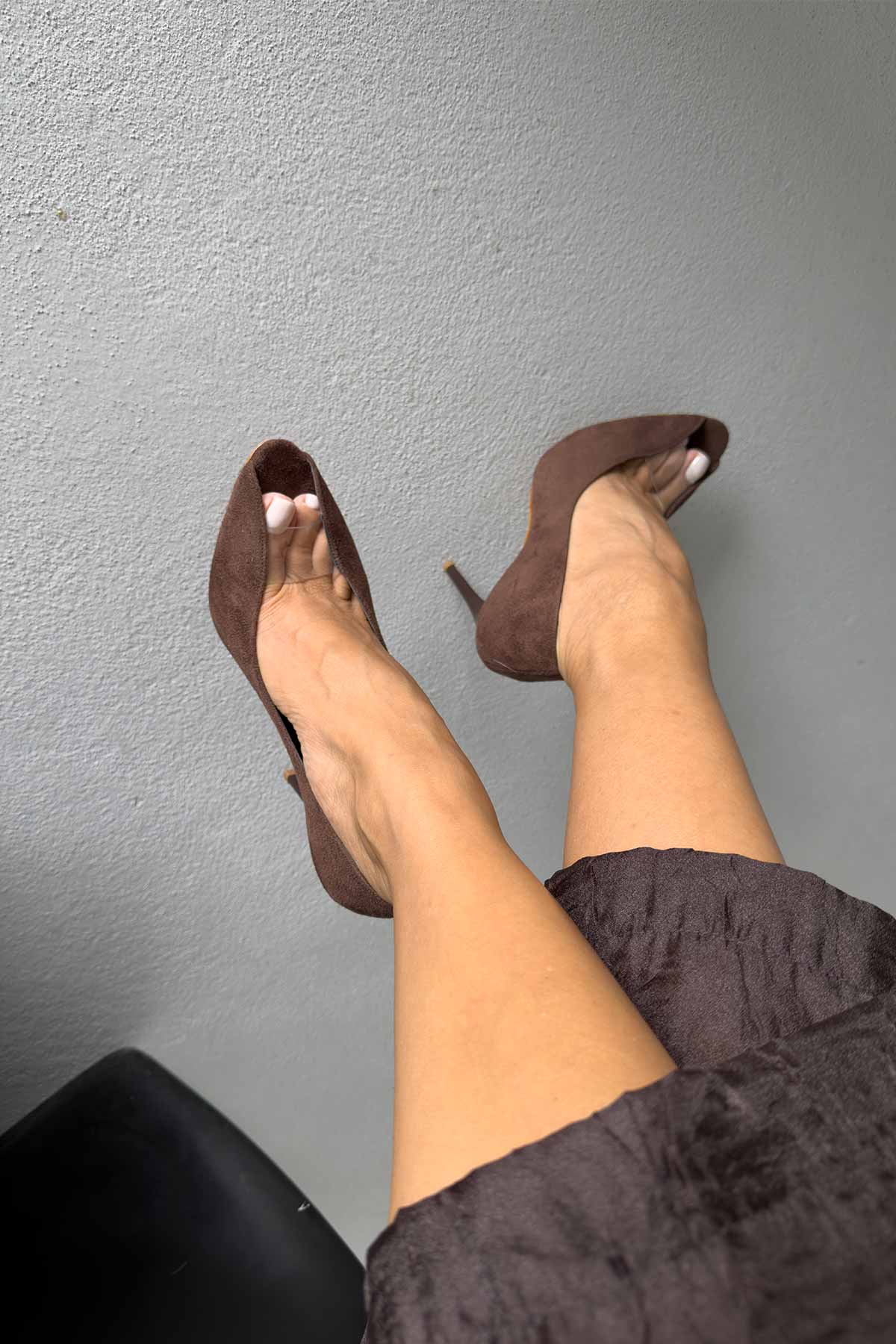 Loan Şeffaf Detaylı İnce Topuk 10 Cm Acı Kahve Süet Stiletto