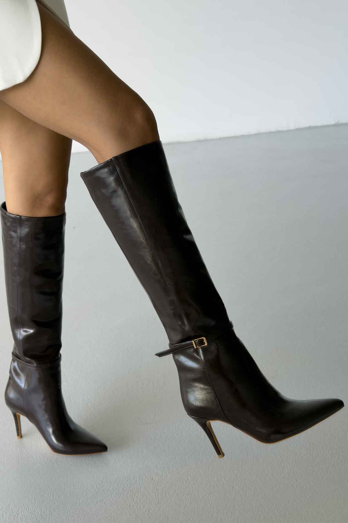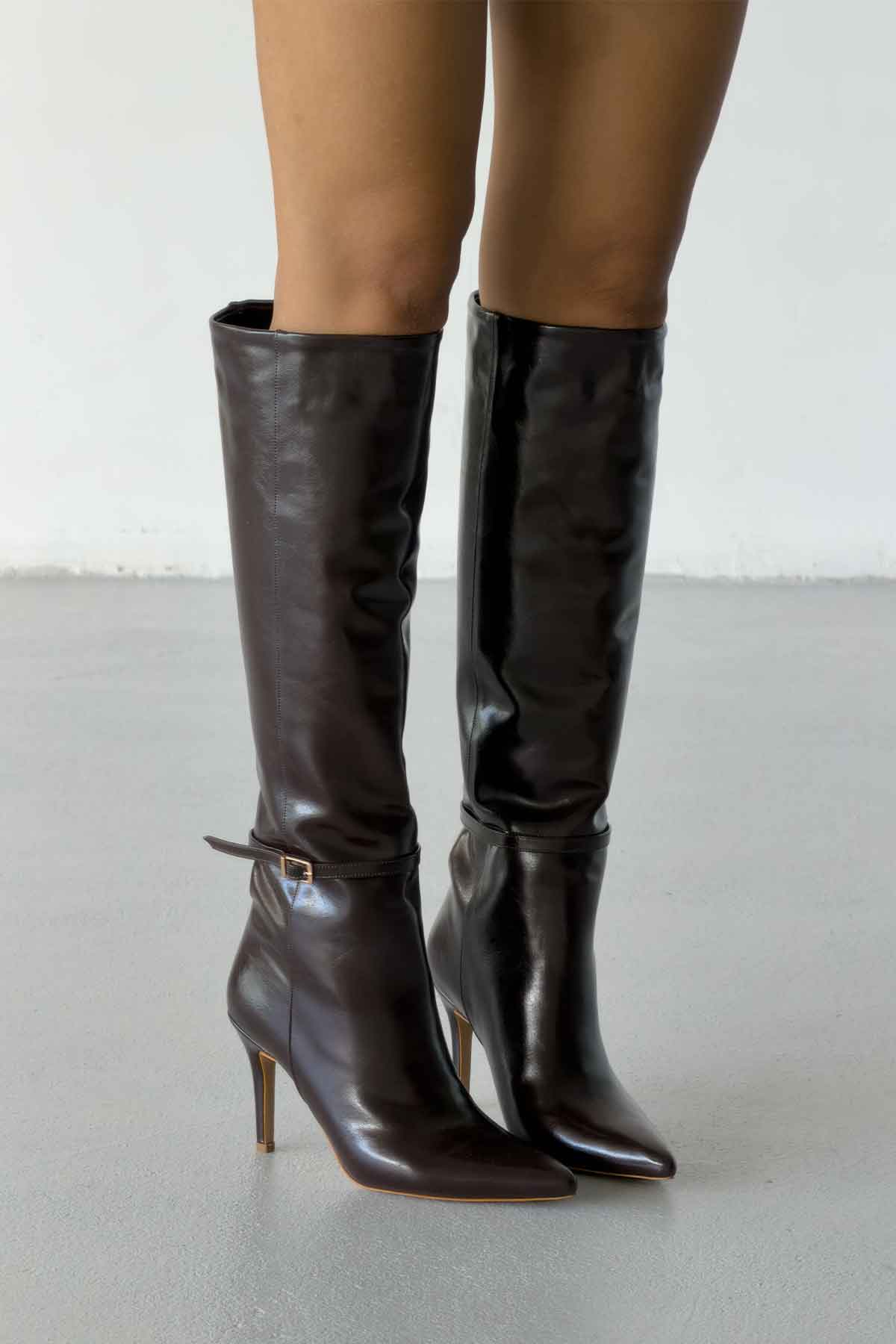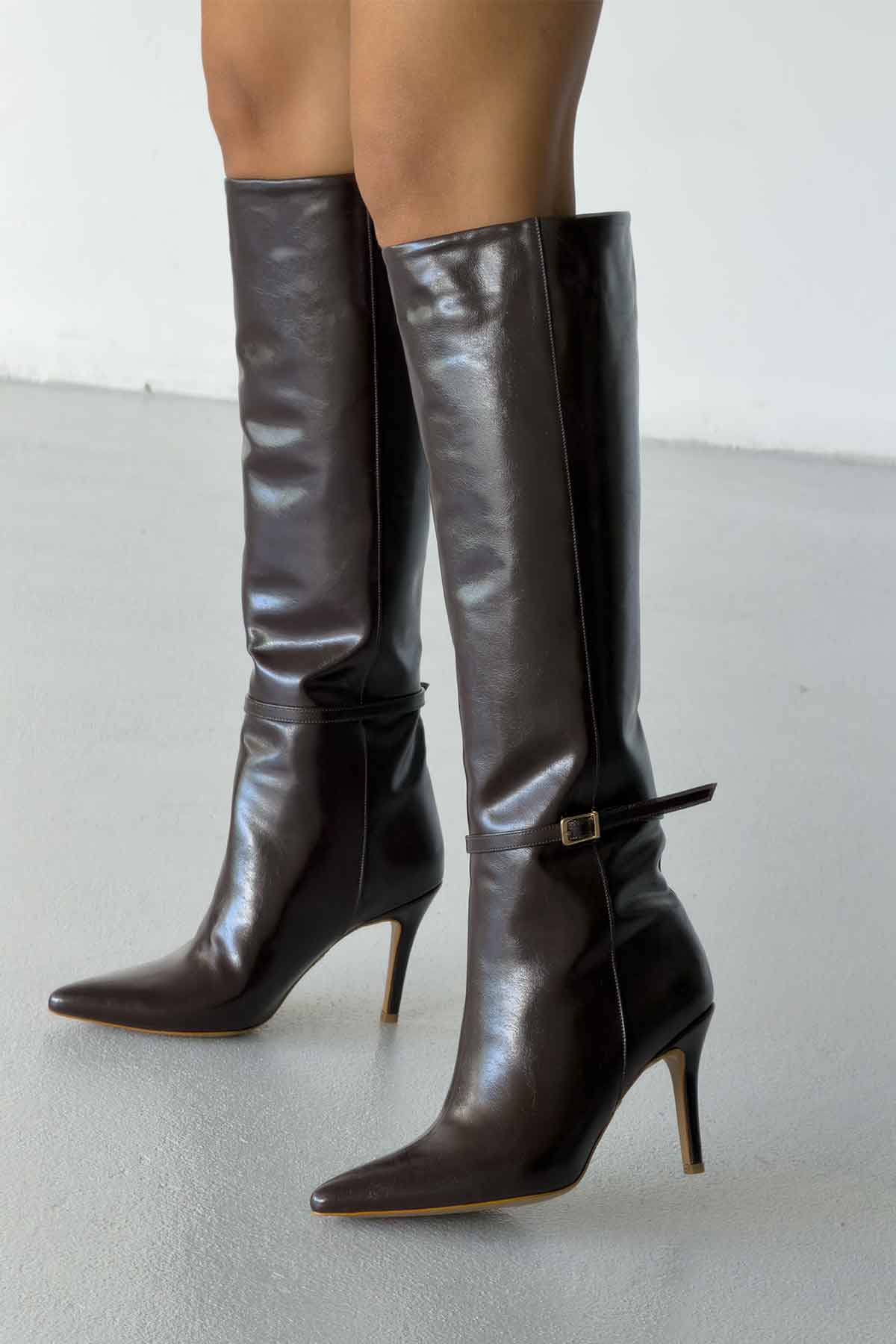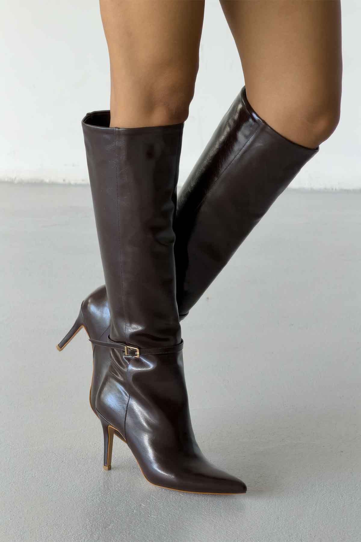 Noelle Toka Detaylı İnce Topuk 10 Cm Kahve Kırışık Rugan Çizme resmi