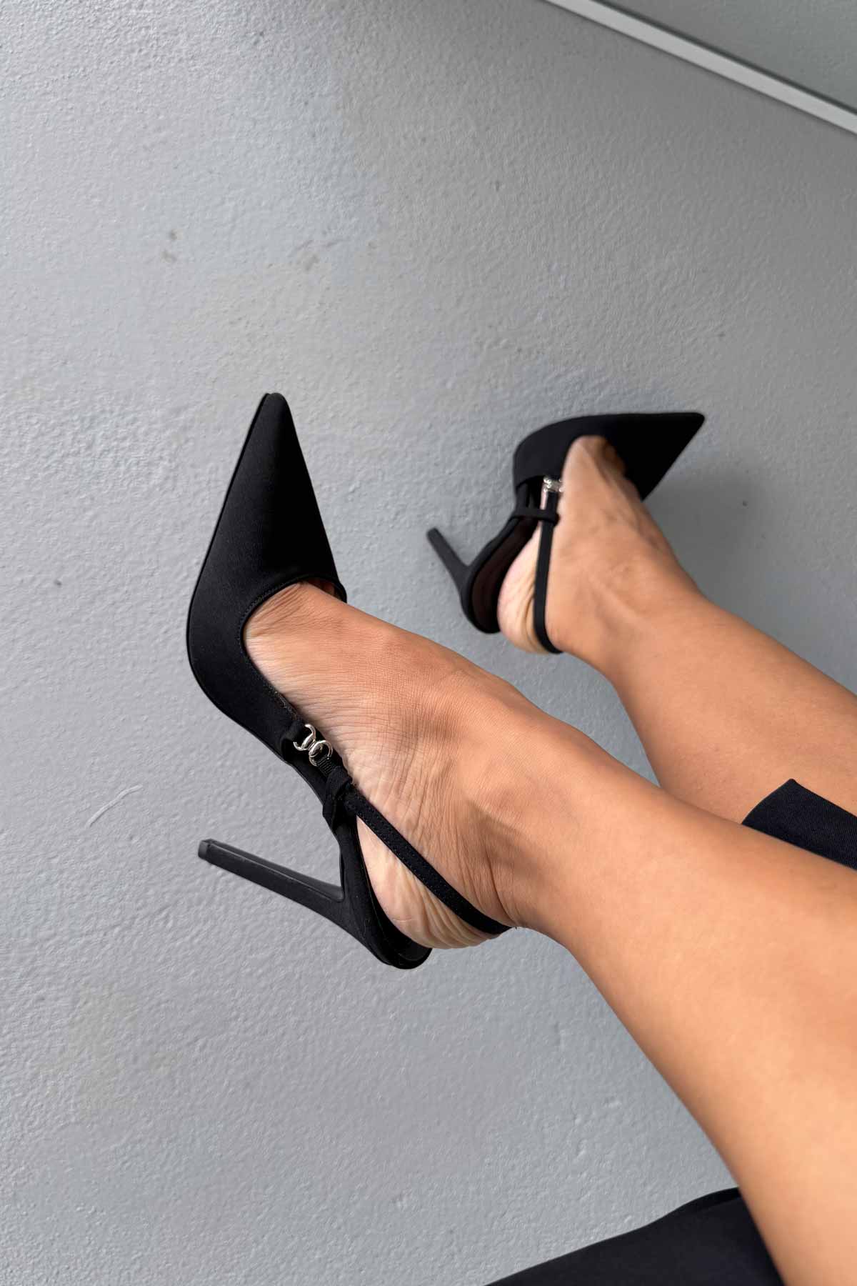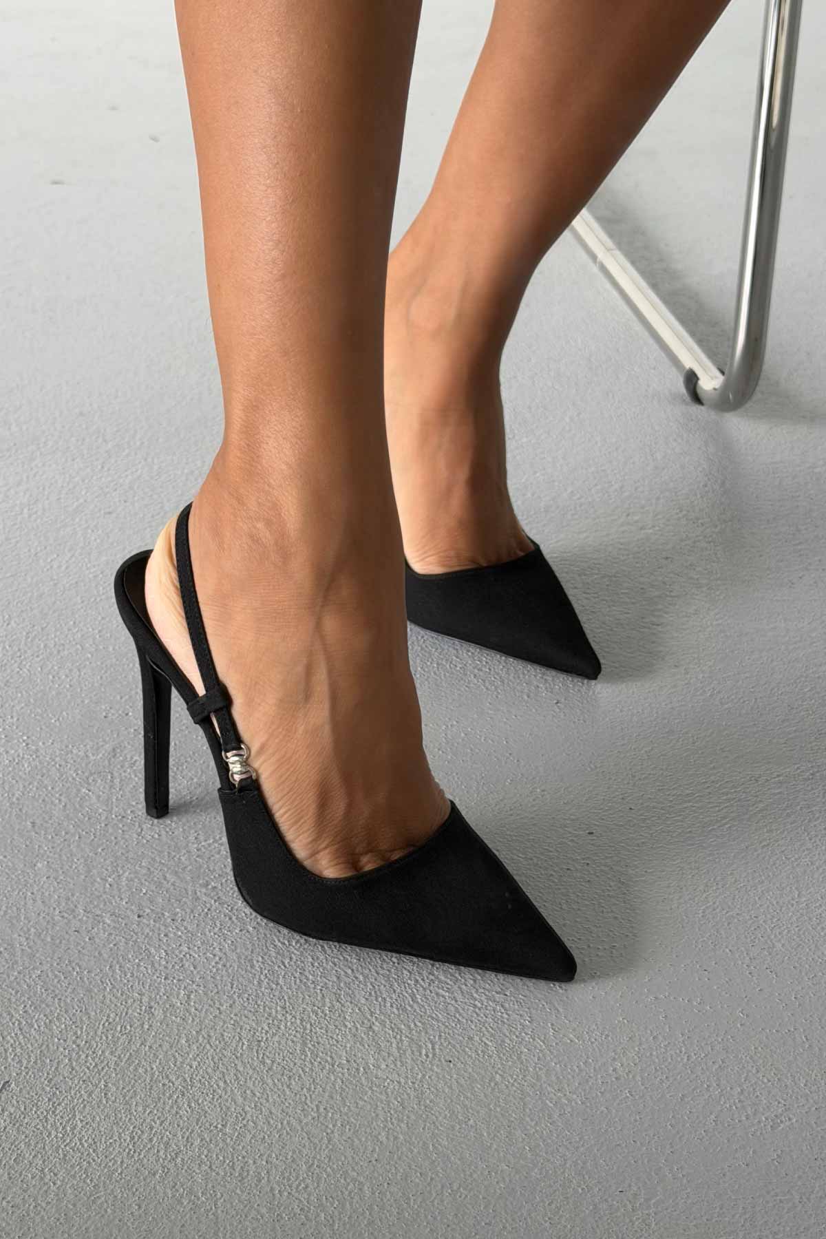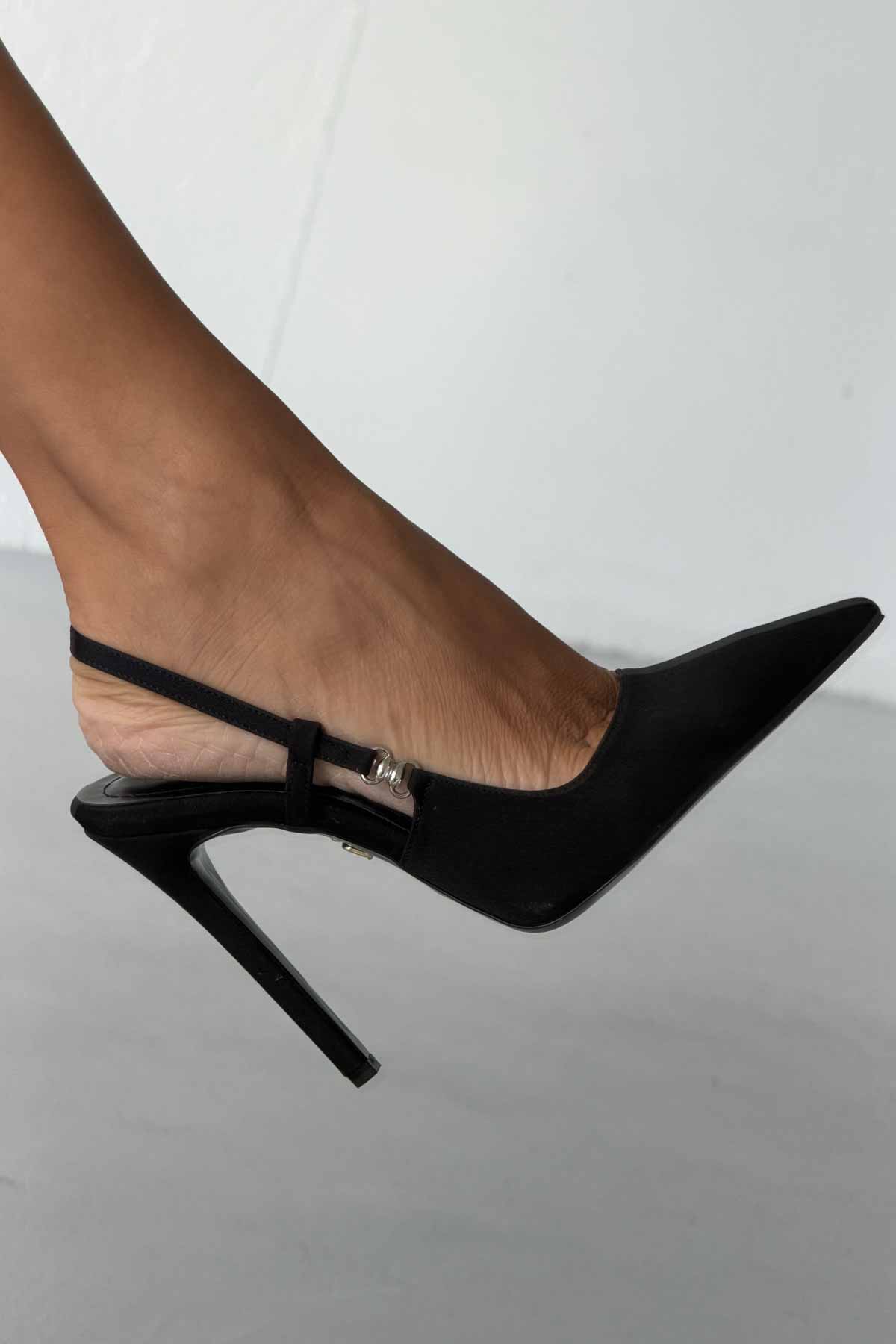 Waft Toka Detaylı İnce Topuk 12 Cm Siyah Mat Saten Stiletto