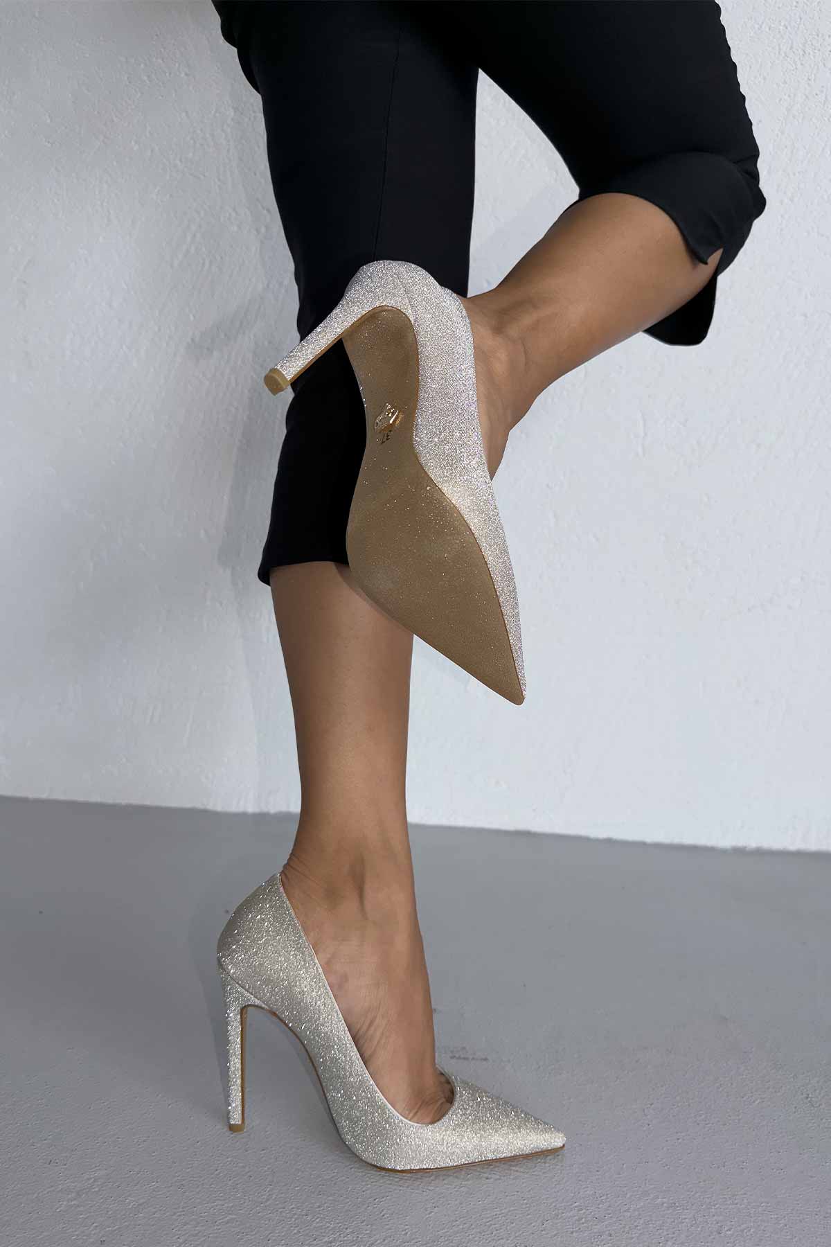 Woods Simli Taban İnce Topuk 12 Cm Gold Simli Stiletto
